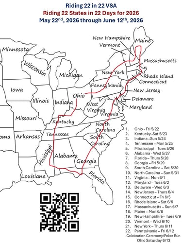 Riding 22 in 22 VSA’s mission is important because every day, an average of 22 veterans lose their battle to suicide, leaving behind families and communities forever changed. By raising awareness and providing support through transportation, lodging, meals, and therapeutic opportunities, we help ensure veterans and their caregivers are not fighting these battles alone. Our mission gives hope, builds connections, and reminds those who served—and those who love them—that their lives matter and that there is a community ready to stand beside them.