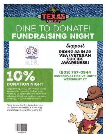 Just show the image of this flyer to your server on your mobile device before paying your bill and they will donate the percentage noted of your bill to help us provide transportation, lodging and meals to veterans and their caregivers while they attend lifesaving mental health treatment.