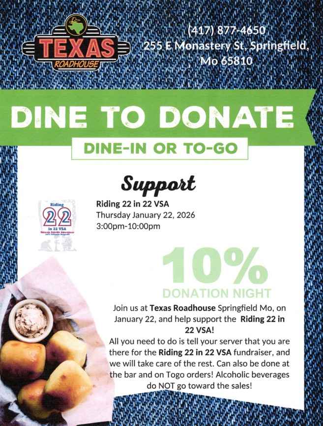 Just show the image of this flyer to your server on your mobile device before paying your bill and they will donate the percentage noted of your bill to help us provide transportation, lodging and meals to veterans and their caregivers while they attend lifesaving mental health treatment.