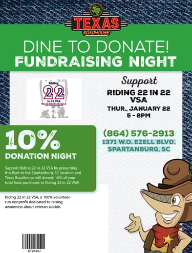 Just show the image of this flyer to your server on your mobile device before paying your bill and they will donate the percentage noted of your bill to help us provide transportation, lodging and meals to veterans and their caregivers while they attend lifesaving mental health treatment.