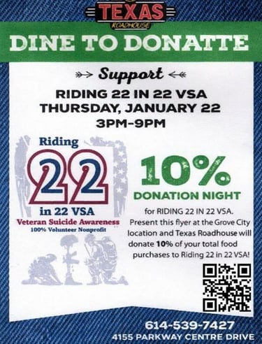 Just show the image of this flyer to your server on your mobile device before paying your bill and they will donate the percentage noted of your bill to help us provide transportation, lodging and meals to veterans and their caregivers while they attend lifesaving mental health treatment.