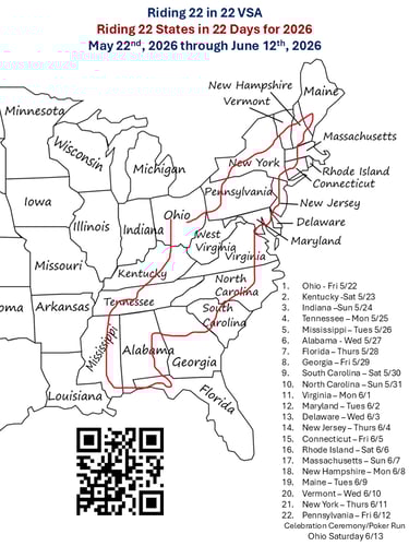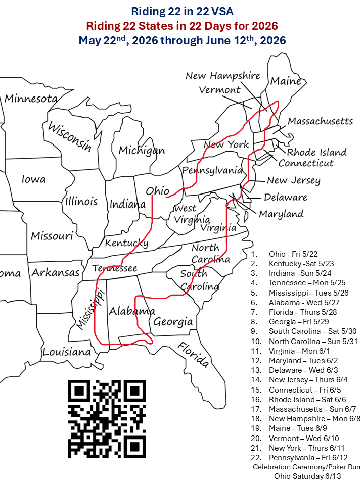 Riding 22 in 22 VSA’s mission is important because every day, an average of 22 veterans lose their battle to suicide, leaving behind families and communities forever changed. By raising awareness and providing support through transportation, lodging, meals, and therapeutic opportunities, we help ensure veterans and their caregivers are not fighting these battles alone. Our mission gives hope, builds connections, and reminds those who served—and those who love them—that their lives matter and that there is a community ready to stand beside them.